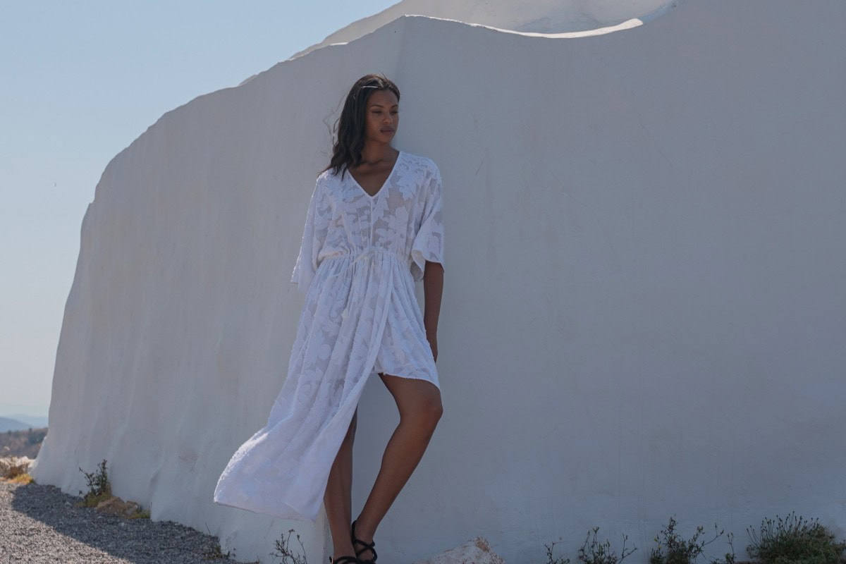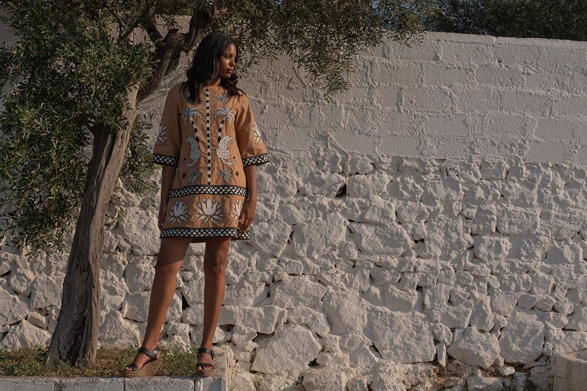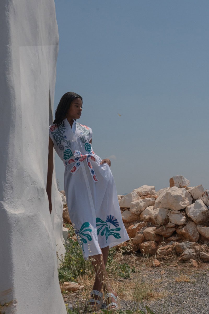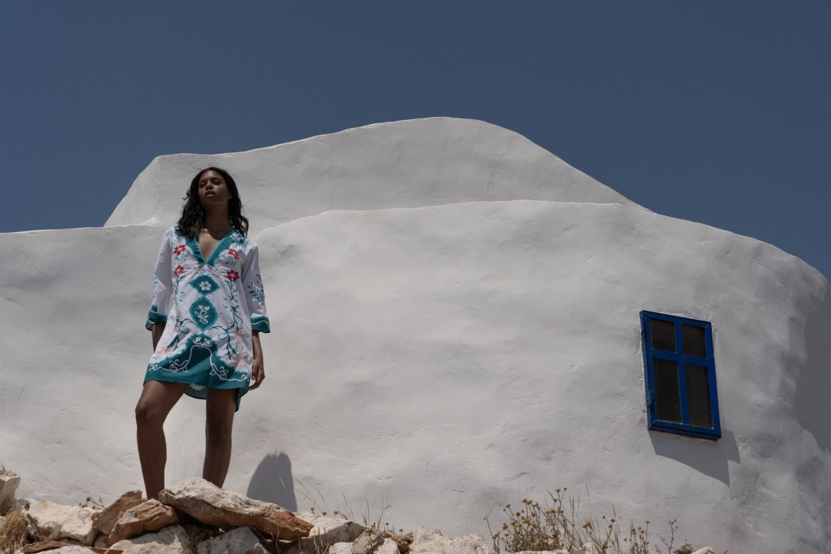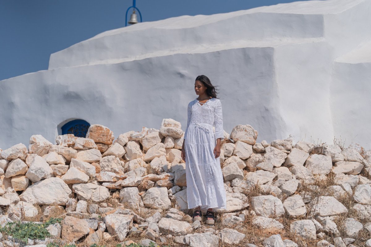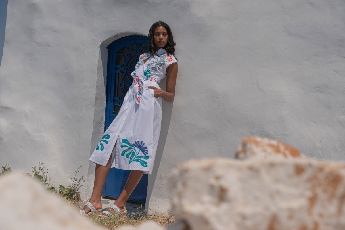 Les vêtements de ADA KAMARA s’inspirent du minimalisme cycladique combiné à des éléments colorés du pays de fabrication, l’Inde.