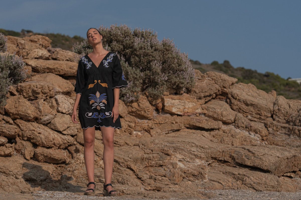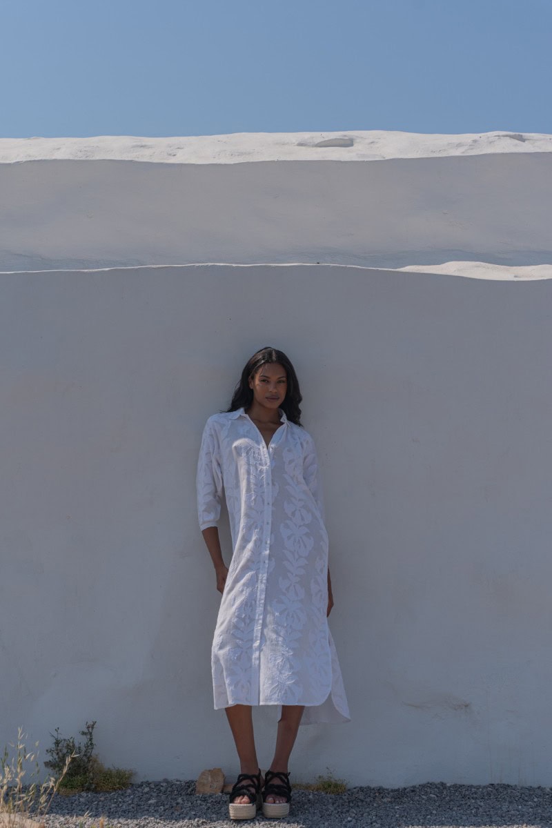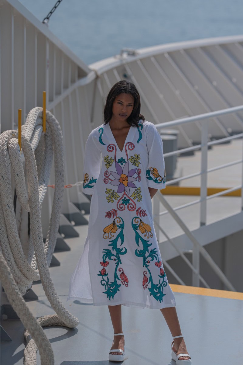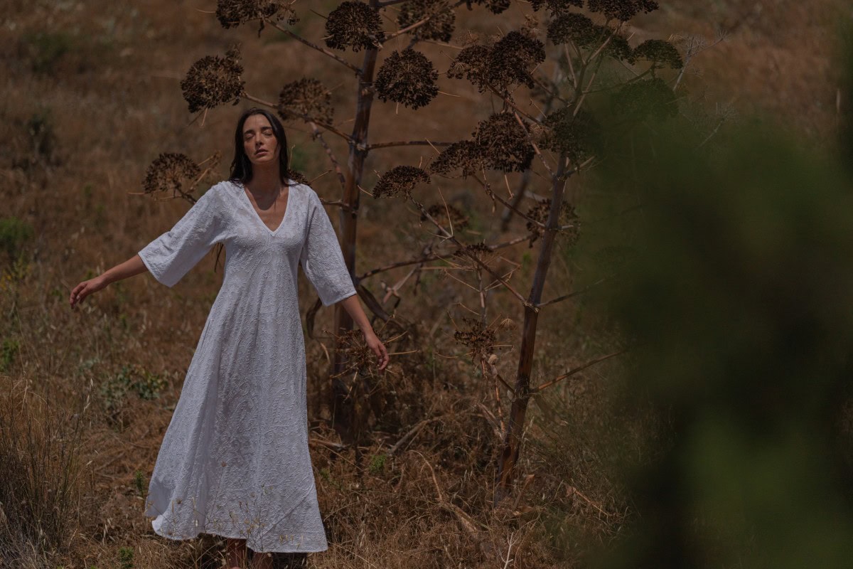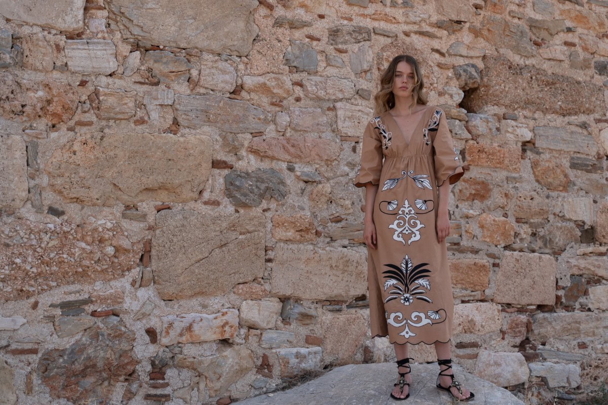 Les vêtements de ADA KAMARA s’inspirent du minimalisme cycladique combiné à des éléments colorés du pays de fabrication, l’Inde.