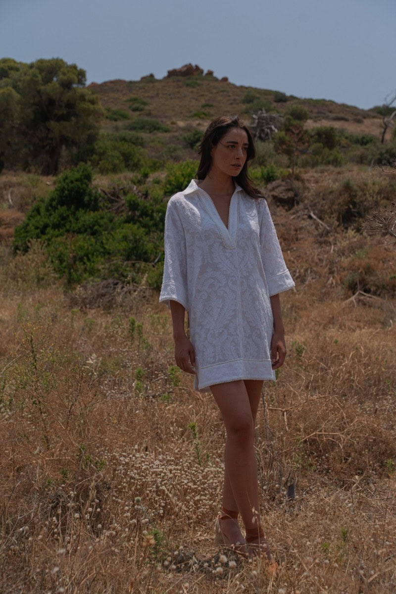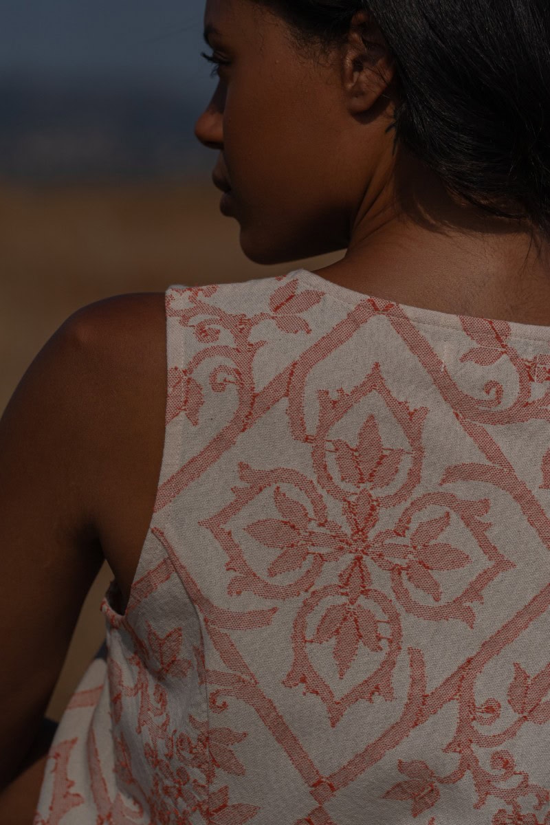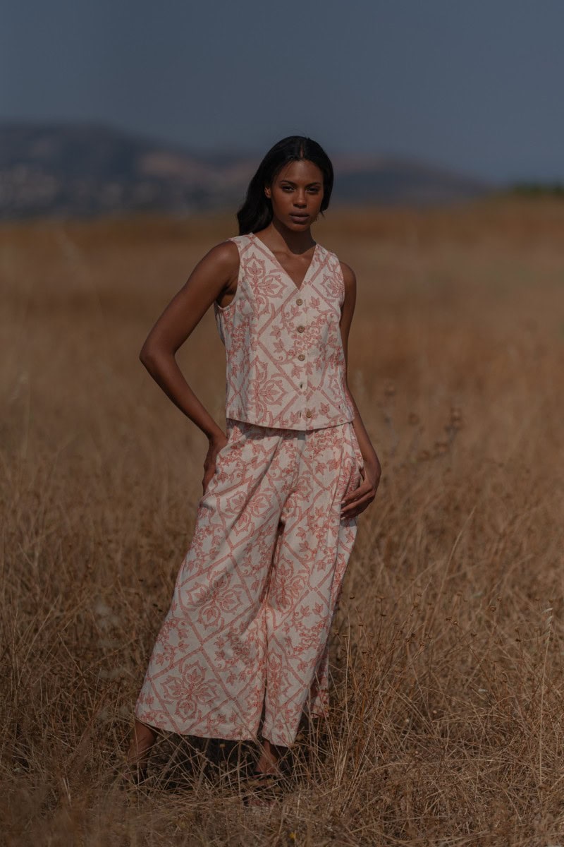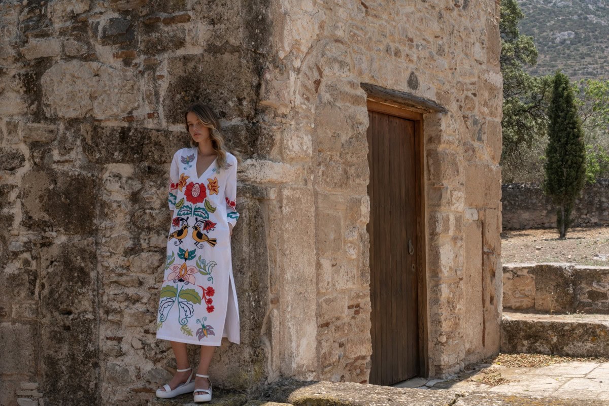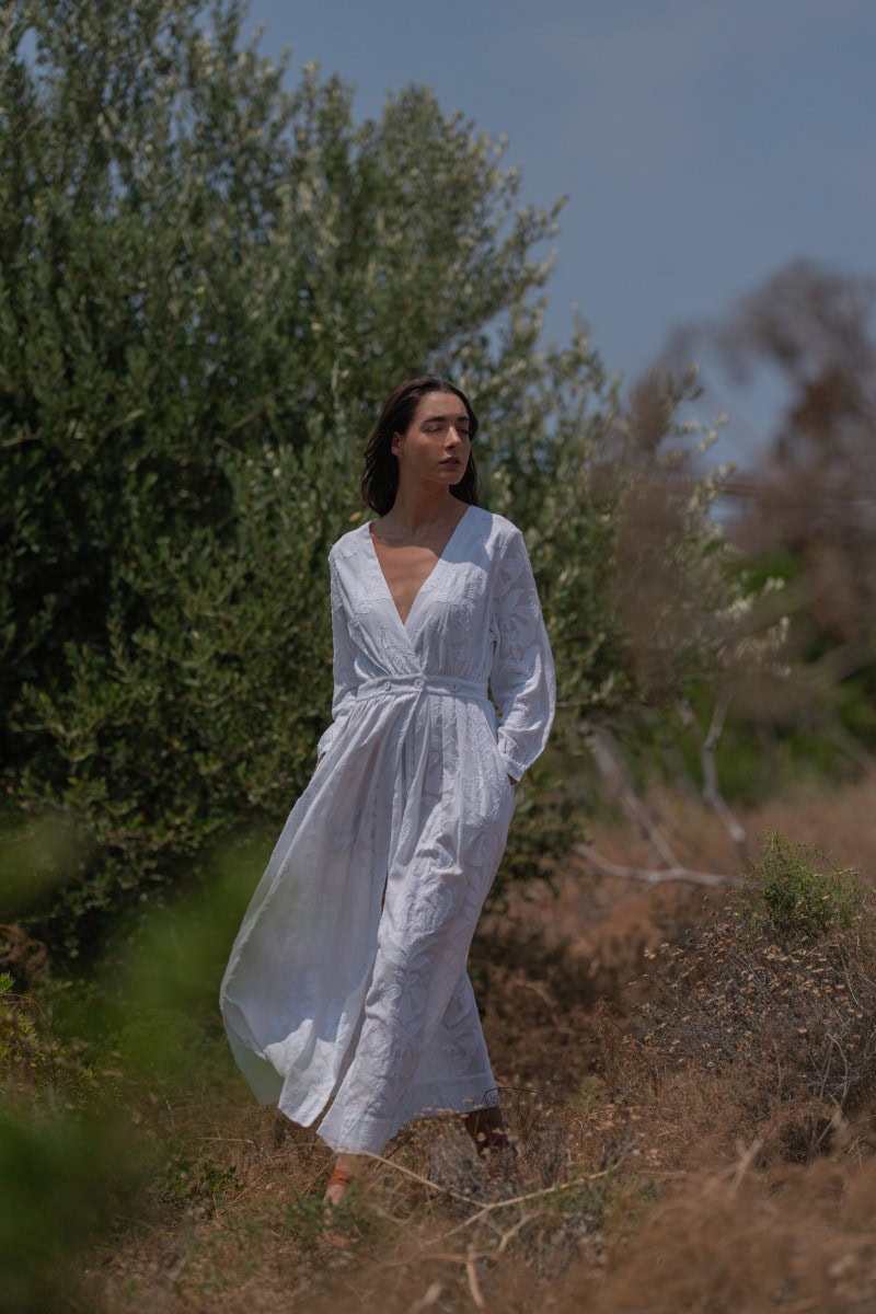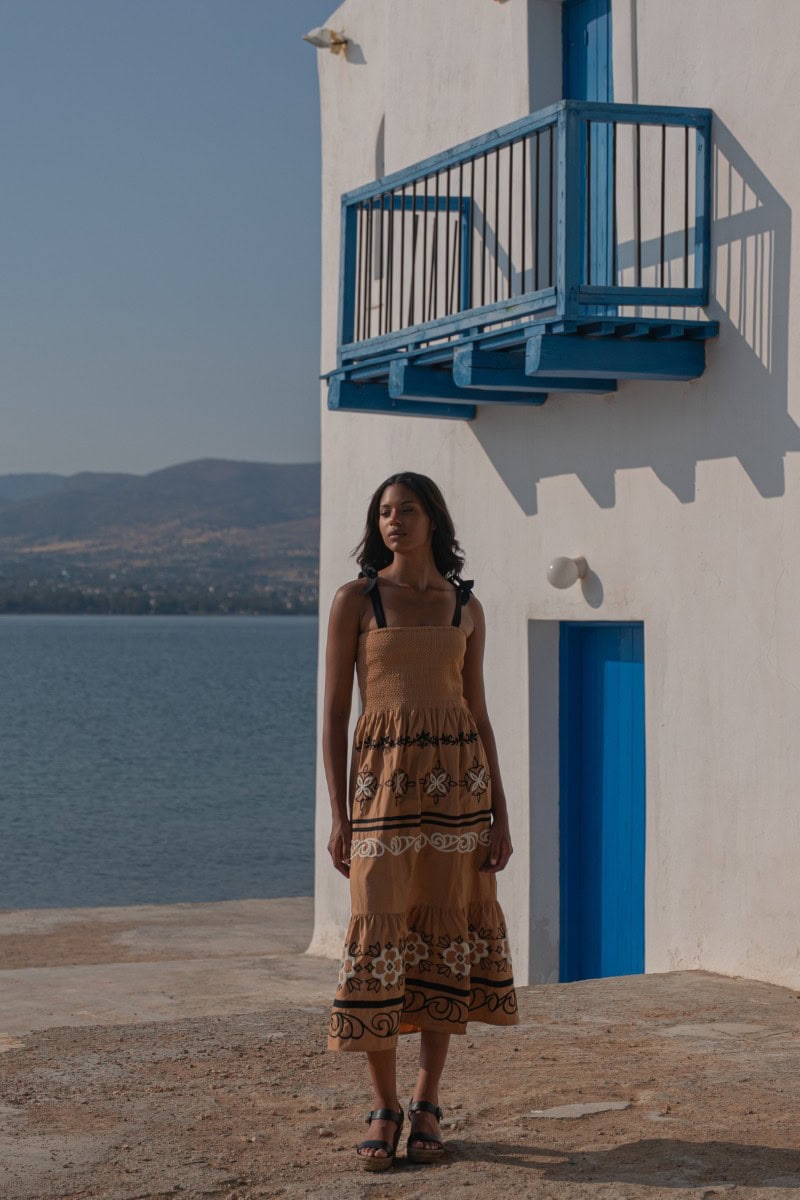 Les vêtements de ADA KAMARA s’inspirent du minimalisme cycladique combiné à des éléments colorés du pays de fabrication, l’Inde.