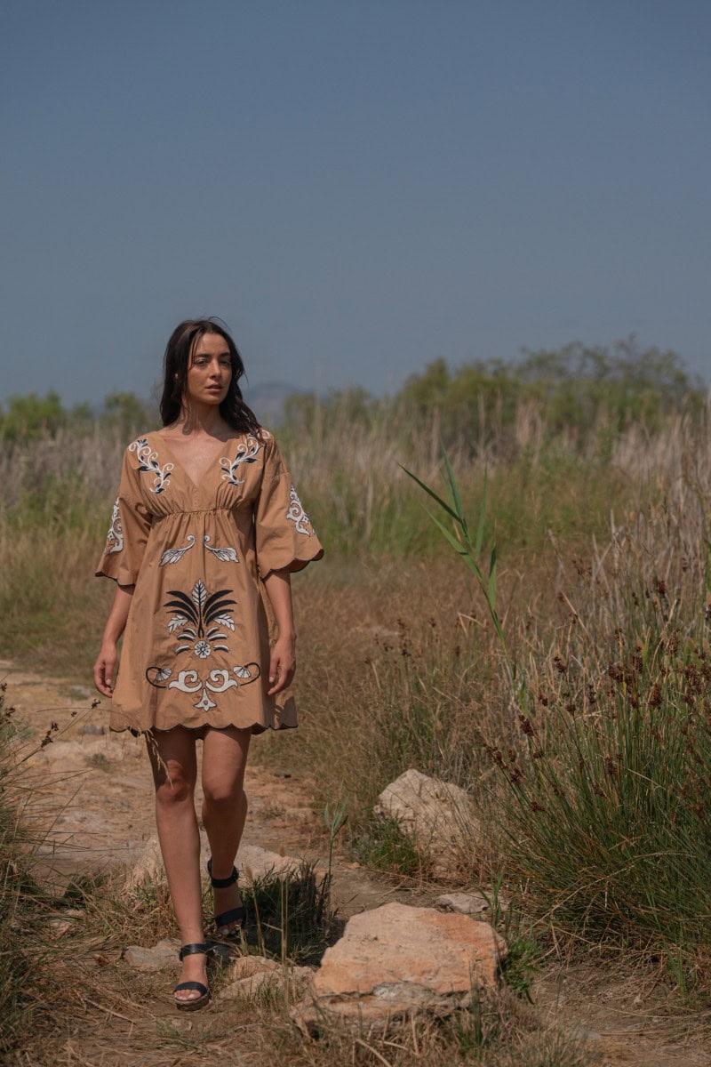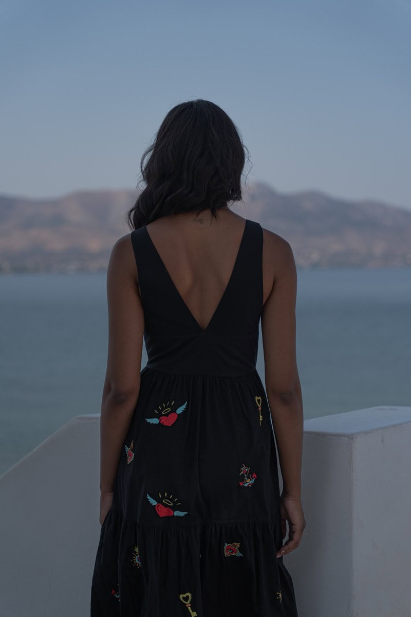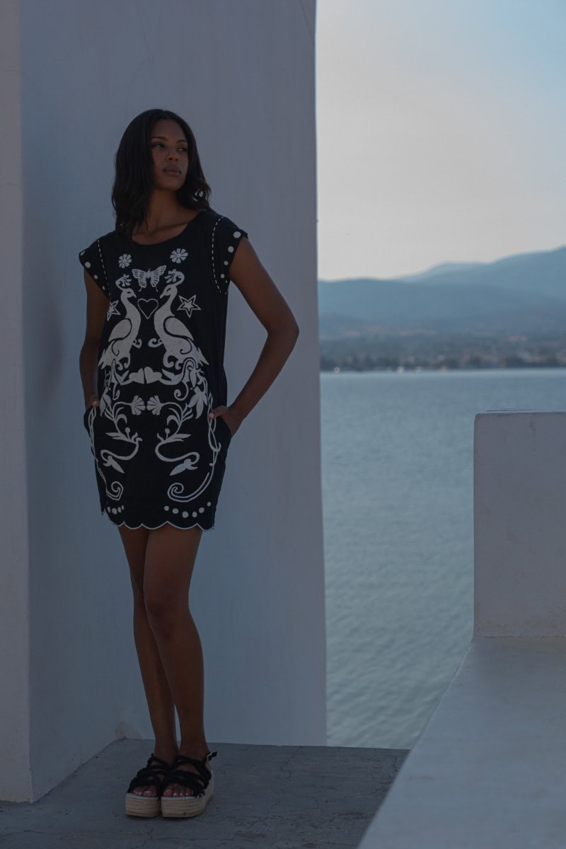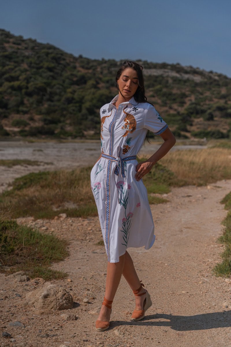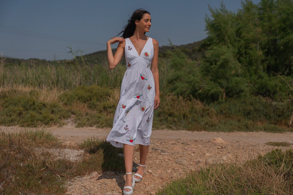 Les vêtements de ADA KAMARA s’inspirent du minimalisme cycladique combiné à des éléments colorés du pays de fabrication, l’Inde.