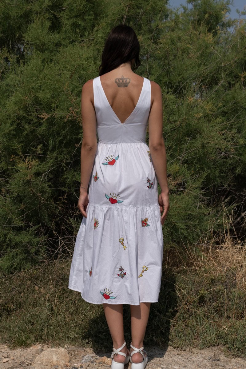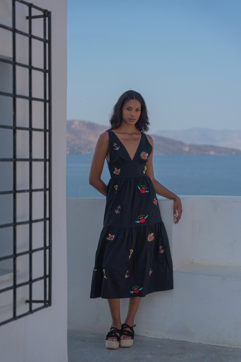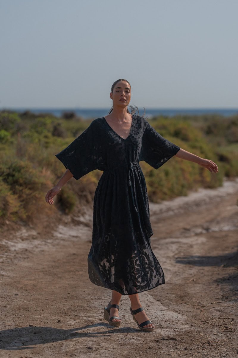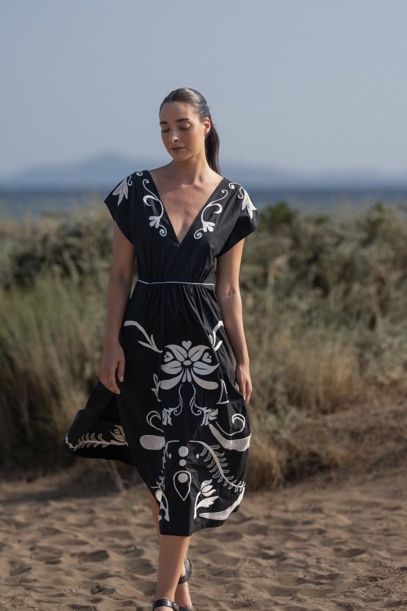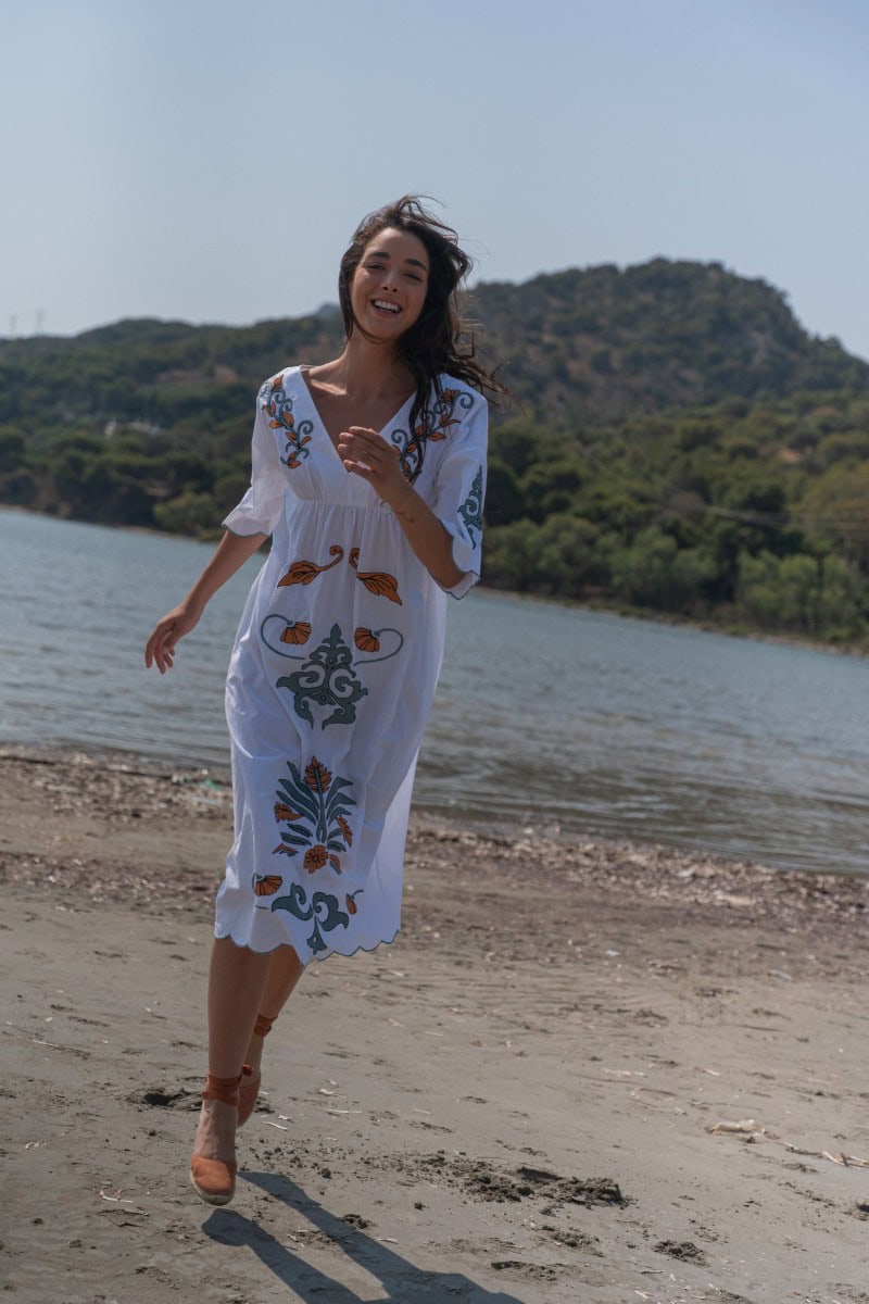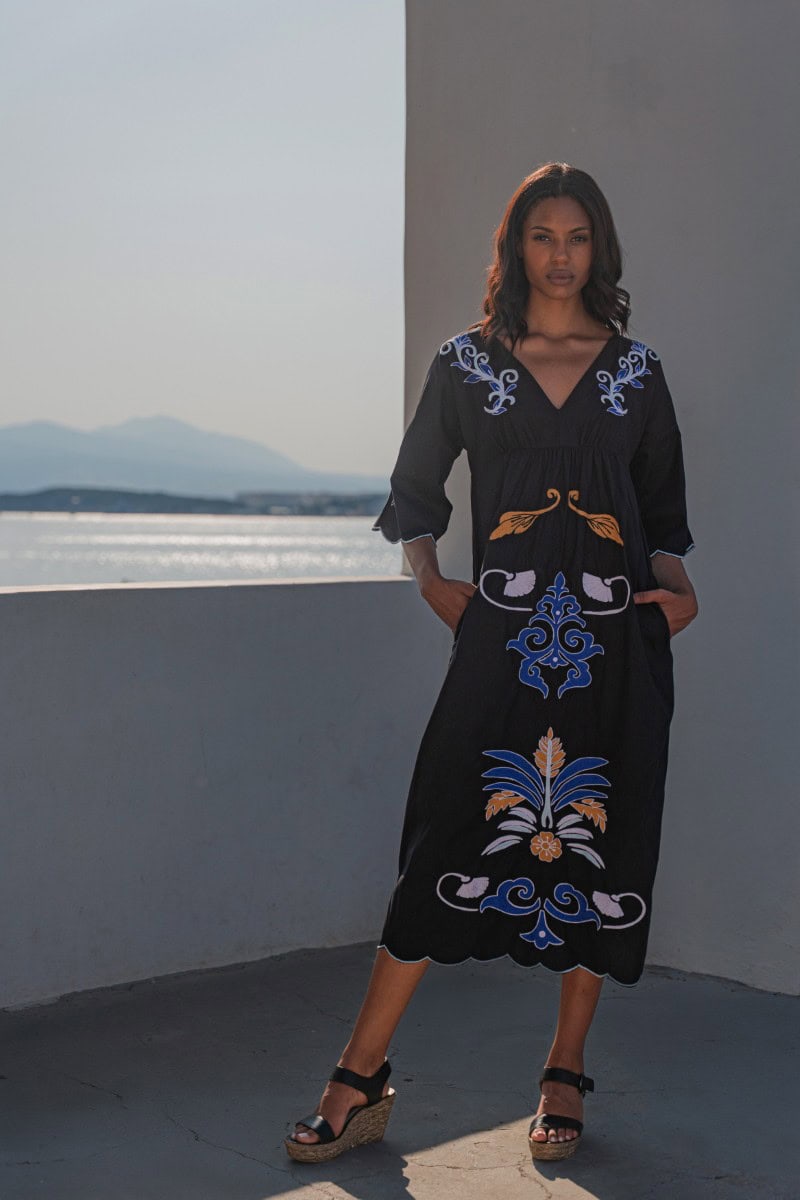 Les vêtements de ADA KAMARA s’inspirent du minimalisme cycladique combiné à des éléments colorés du pays de fabrication, l’Inde.